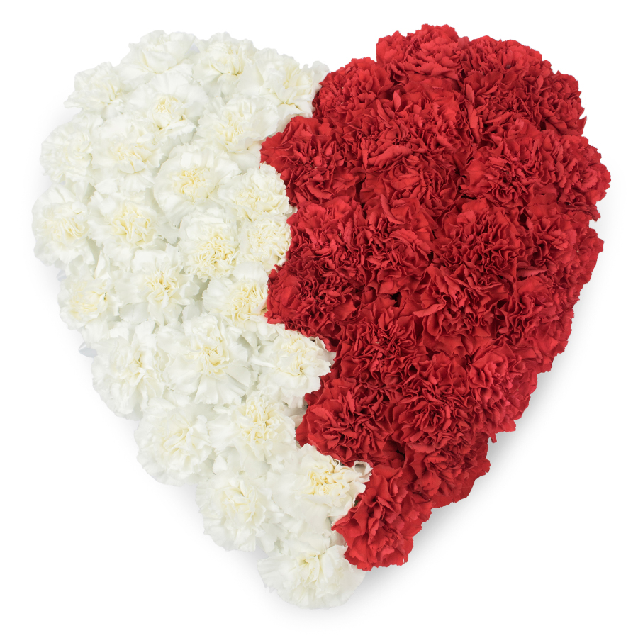 Delight in the exquisite beauty of our heart-shaped red and white carnation bouquet. This arrangement features a harmonious blend of pure white and vibrant red carnations, each hand-selected for their superior freshness and color.